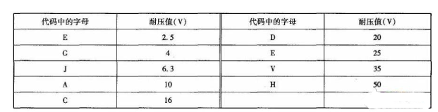 ③使用代碼法,通常由一個字母和三個數(shù)字組成,字母表示電解電容的耐壓值,數(shù)字用來標(biāo)明電容量,單位為pF。前兩位數(shù)字表示電容量的有效數(shù)字,第三位數(shù)字表示有效數(shù)字乘以10的冪次。貼片電解電容上面的指示條標(biāo)明此端為電解電容的正極。貼片電解電容代碼中的字母與耐壓值的關(guān)系見下表。